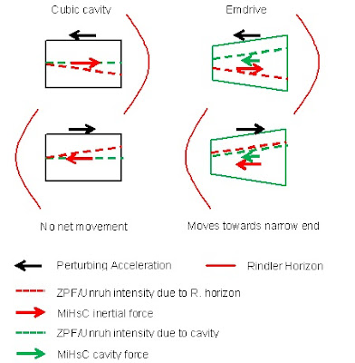 Now look at the emdrive cavity (right hand side). Again we accelerate it left and right, and again the Unruh radiation spectrum decreases towards the horizon making a force that counters the initial acceleration, but now the cavity itself, assuming it's like a horizon and MiHsC applies, also damps the Unruh radiation more at the narrow end (see the green dashed line, which shows decreasing power towards the narrow end). This then, for both left and right acceleration pushes the emdrive towards its narrow end. The acceleration is essential, because without it you wouldn't have the Unruh field and the cavity wouldn't be able to make it asymmetric.
