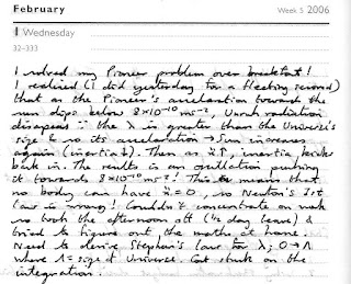 It was just a bit over 10 years ago that I took the first step into the MiHsC paradigm, and my diary entry for that day is shown below. I remember excitedly sending an abstract off to the Alternative Gravities Workshop in Edinburgh, 2006, and speaking there later. I also remember being rather desperate to publish quickly for fear that someone else might have the same thought. It is quite amusing that a decade on, I'm still trying to persuade anyone at all to have the same thought! No professional physicist has understood MiHsC, as far as I know. Maybe a couple of mathematicians have.